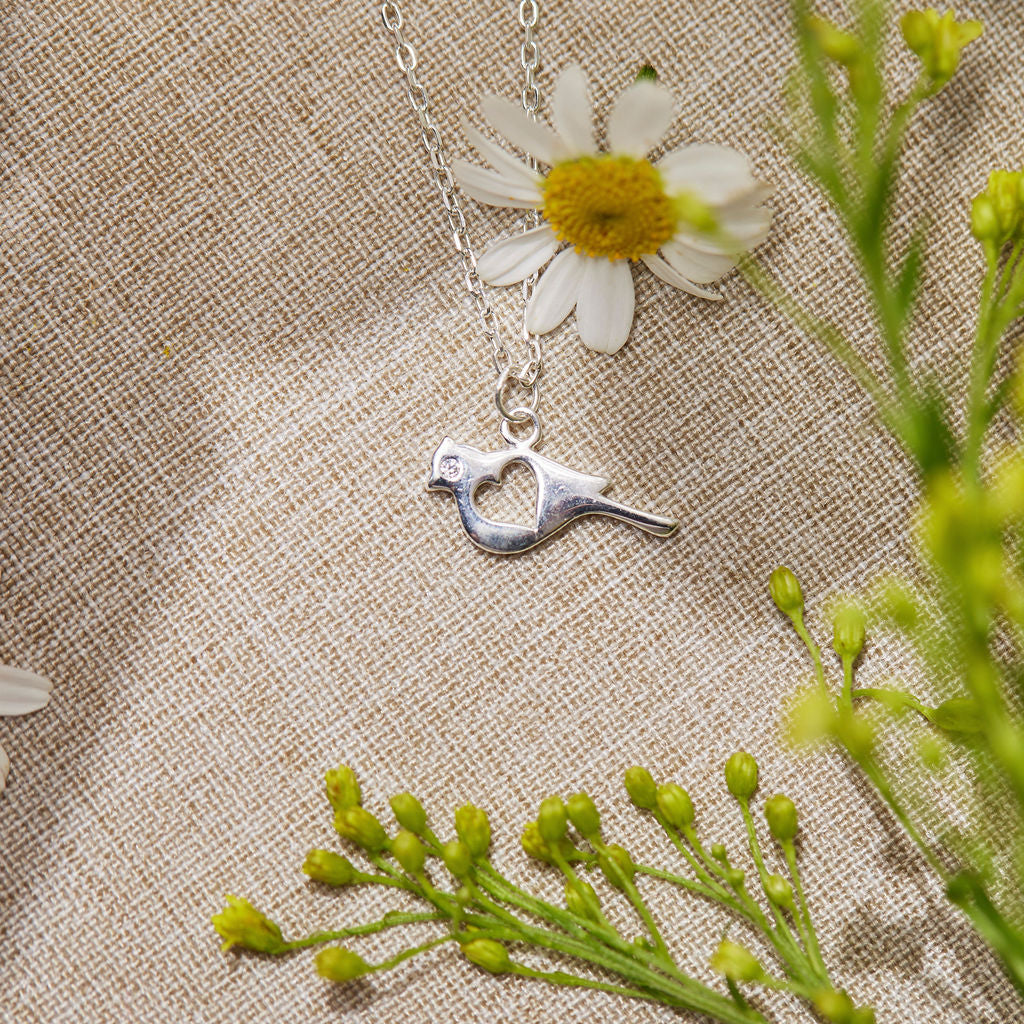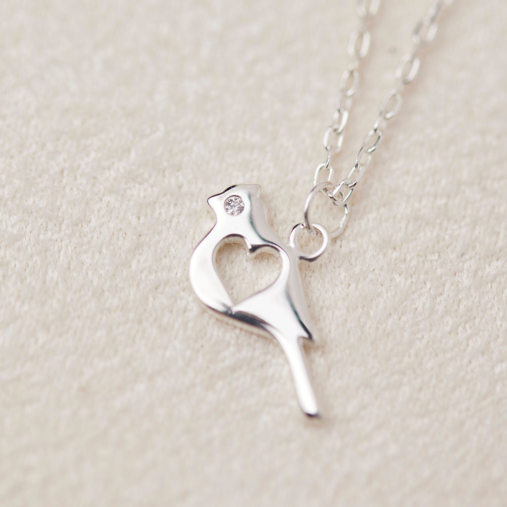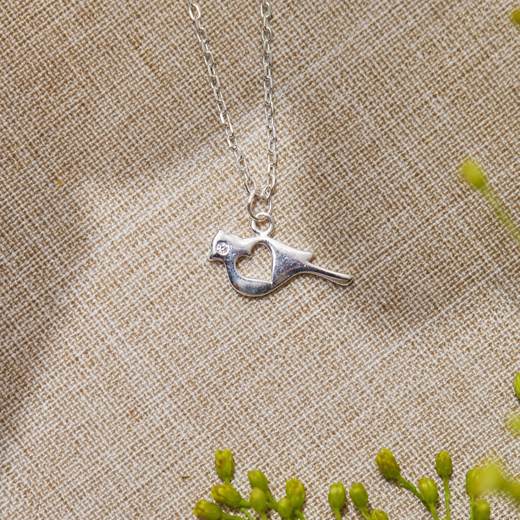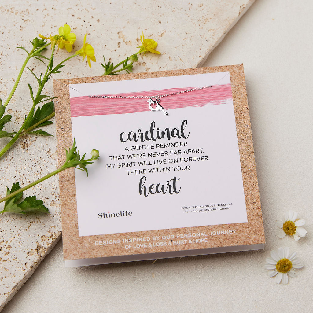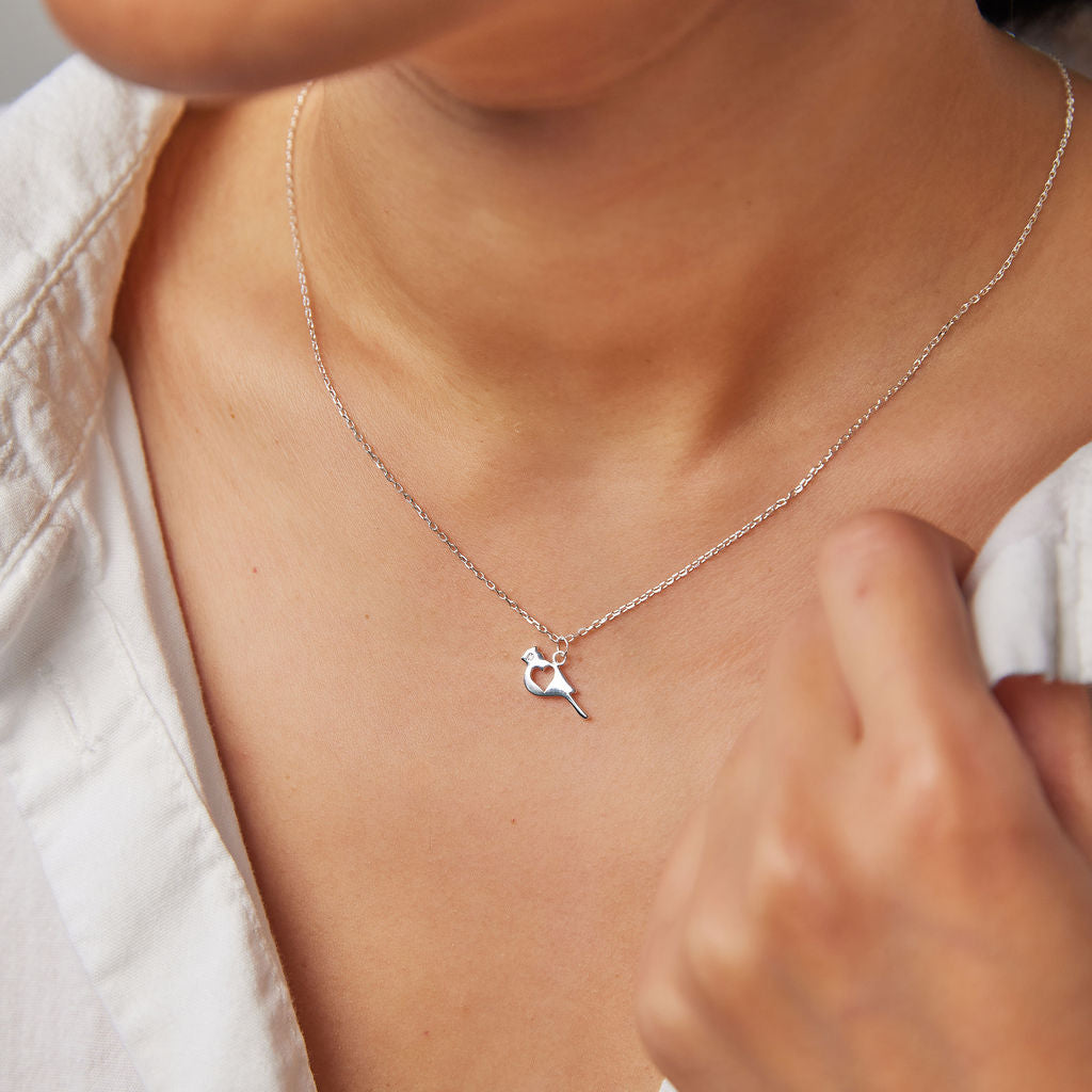 Cardinal holds a crystal in her eye and a heart in her chest, measures 5mm x 13mm, and rests on a 16-18" adjustable chain. Available in sterling silver or 14K gold vermeil.