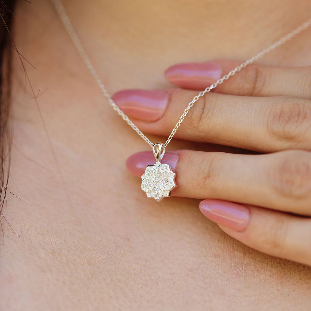 11mm sterling silver flower charm with crystals on an 16-18" sterling silver cable chain.