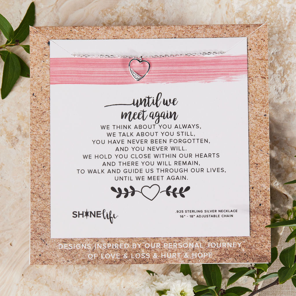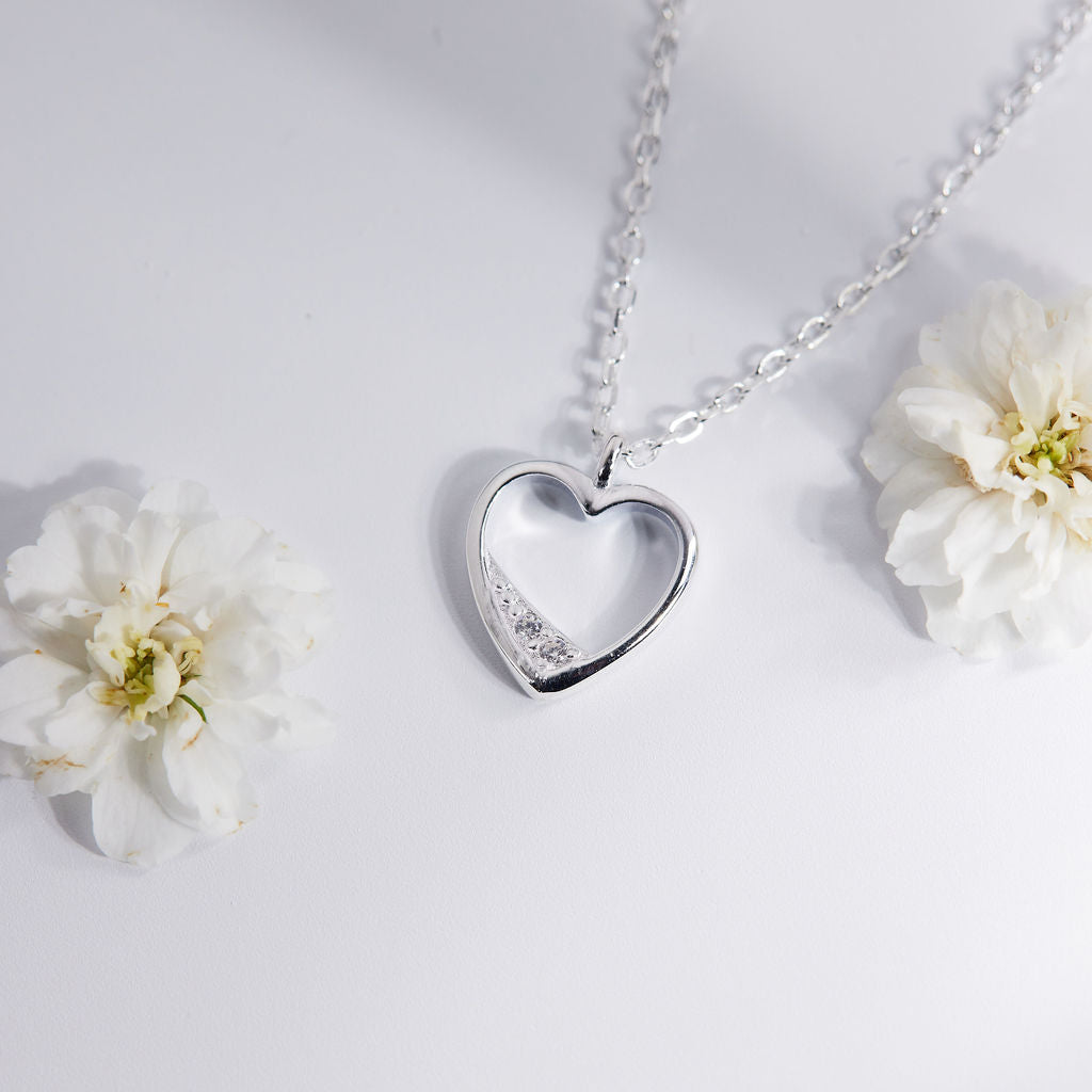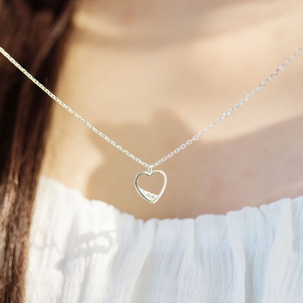 A beautiful gift to honor a loved one that has gained their angel wings. Dainty 10mm x 10mm sterling silver open heart with crystals on an 16-18" shimmering sterling silver cable chain.